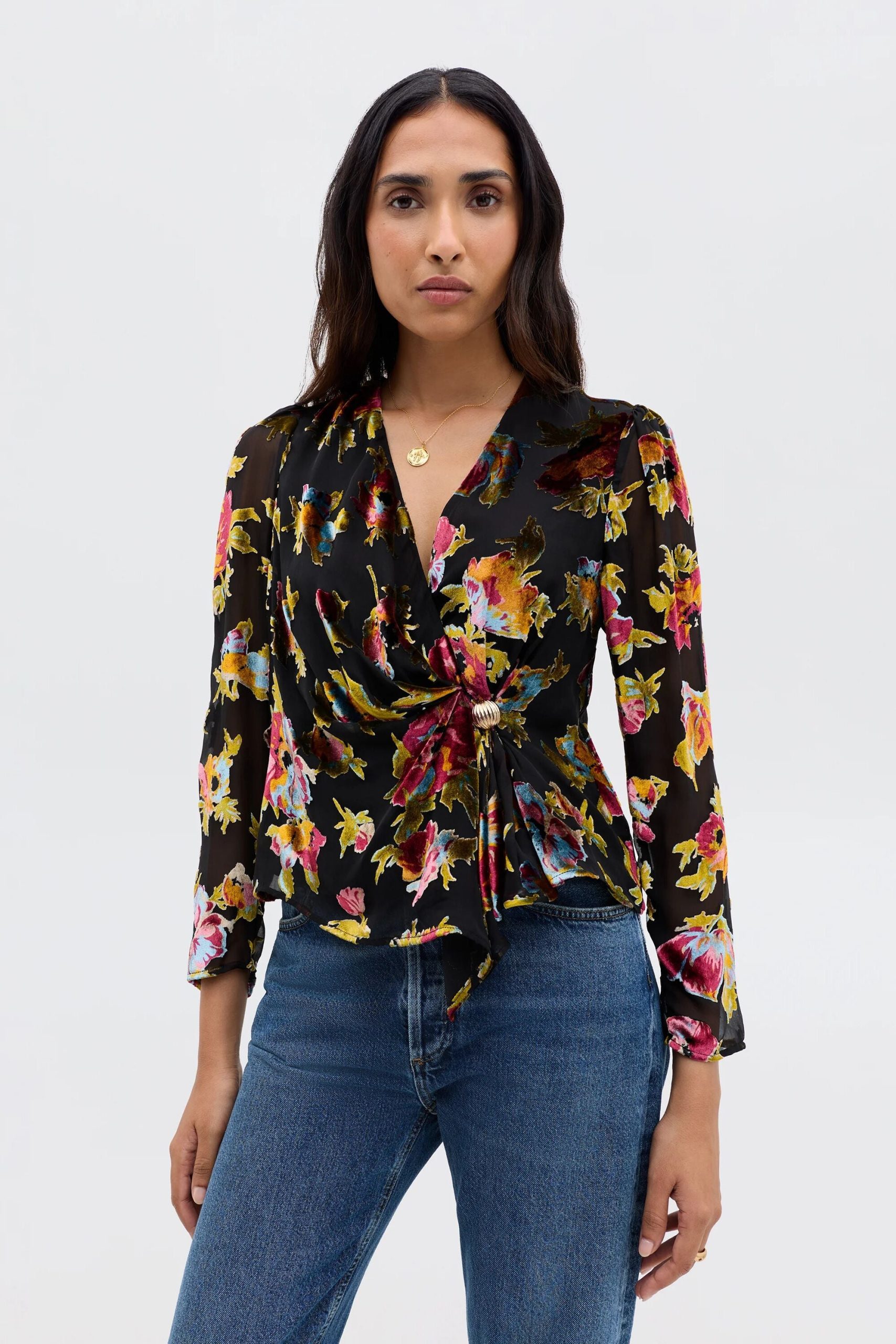Product detailsDetailsIntroducing our Everlyn Top: inspired by the vibrant and eclectic energy of the ’80s, it’s a new classic. Crafted from a luxe Devoré and patterned in a vintage-inspired floral print, Everlyn exudes a sleek, sensuality. The twisted, wrap-around fit is fastened with a beautiful gold clasp for an elegant detailperfect for moments when you want to feel a little more dressed up.Fit