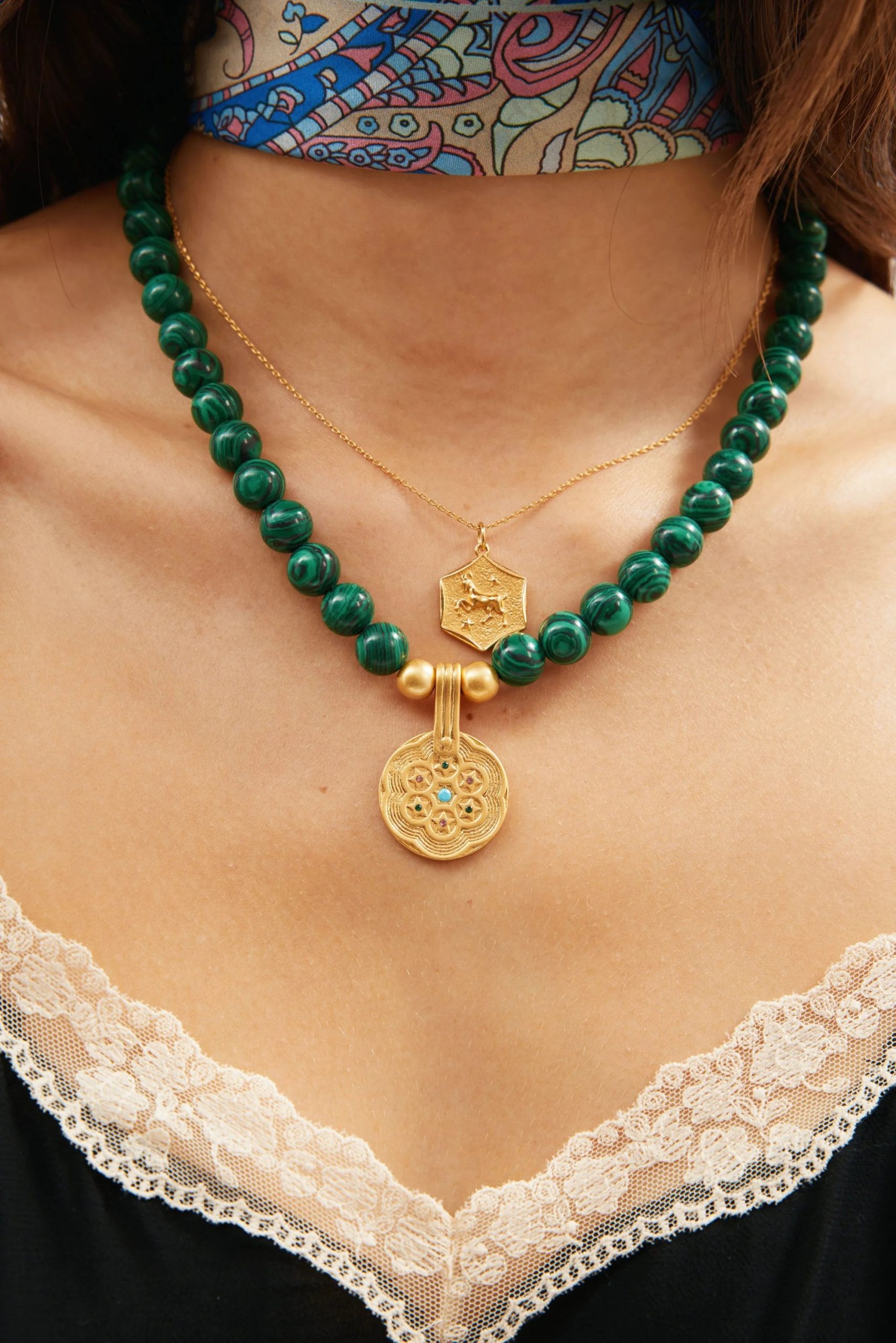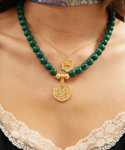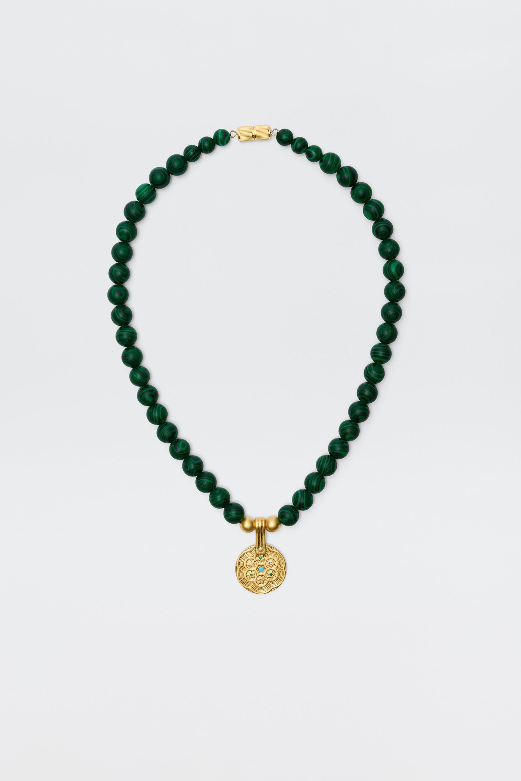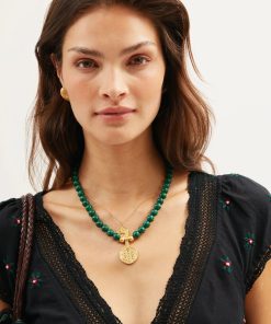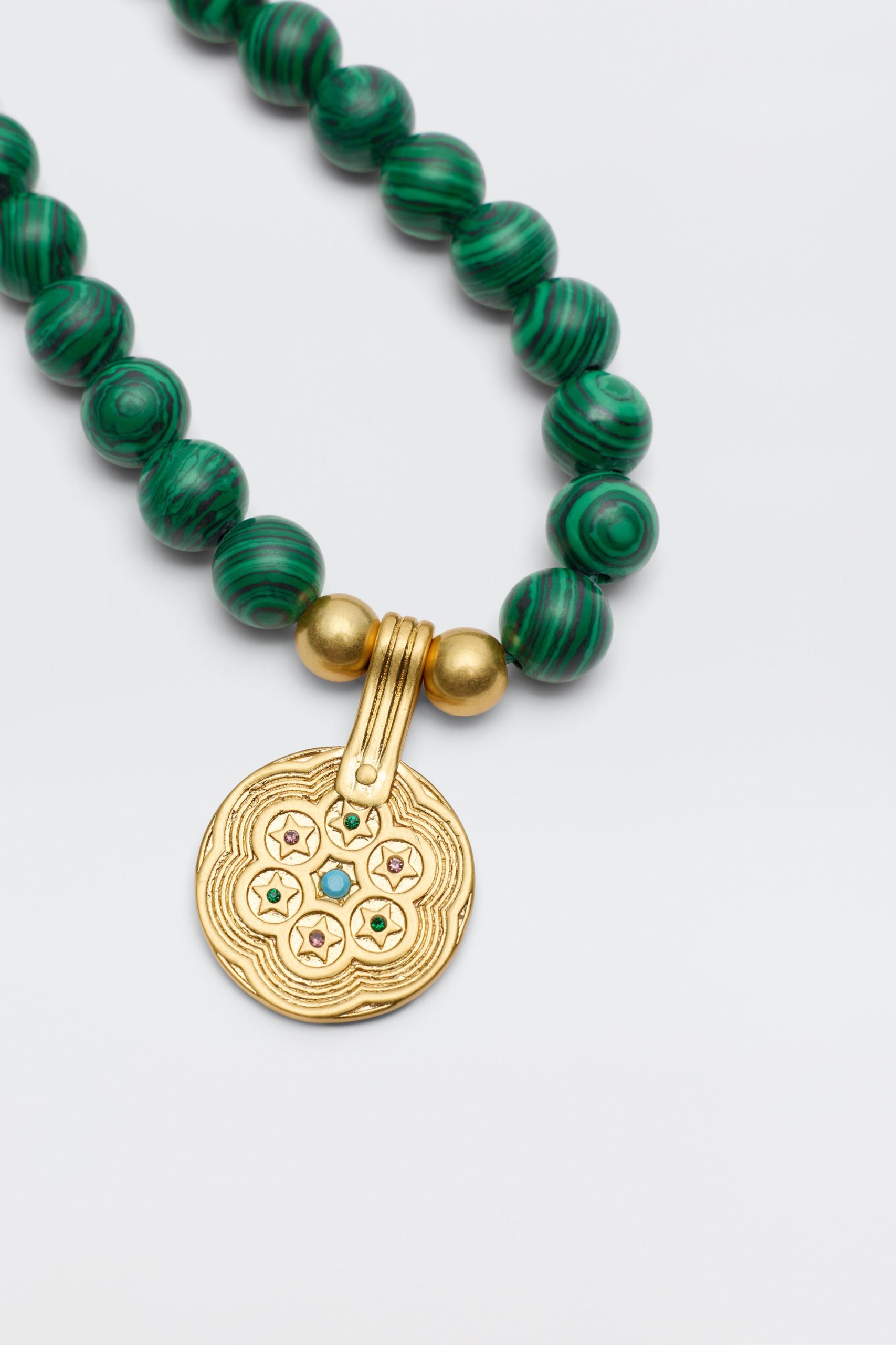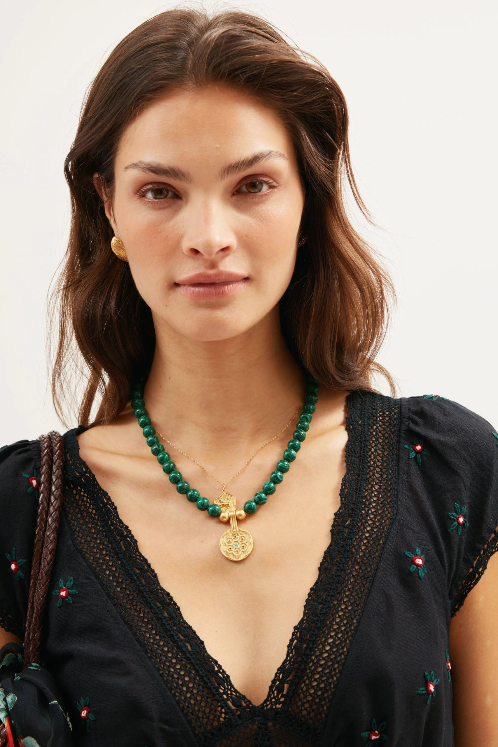 Product detailsDetailsMalachite crystals are thought to have protective properties, and you can be assured that our Ischia necklace’s green beads and turquoise-dotted golden pendant enhance any neckline. Why not gift this style in ourkeep box?Fit