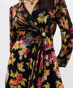 Product detailsDetailsIntroducing the Kensley Dress: Short, sweet and a little bit sexy. The beautiful wrap around fit is finished with an antique-inspired gold button and the hem is asymmetrica playful nod to the vibrant spirit of the ’80s. Crafted from a bright Devoré print but with black as the base colour, there’s a refined maximalism to this style making it the ultimate cocktail dress.Fit