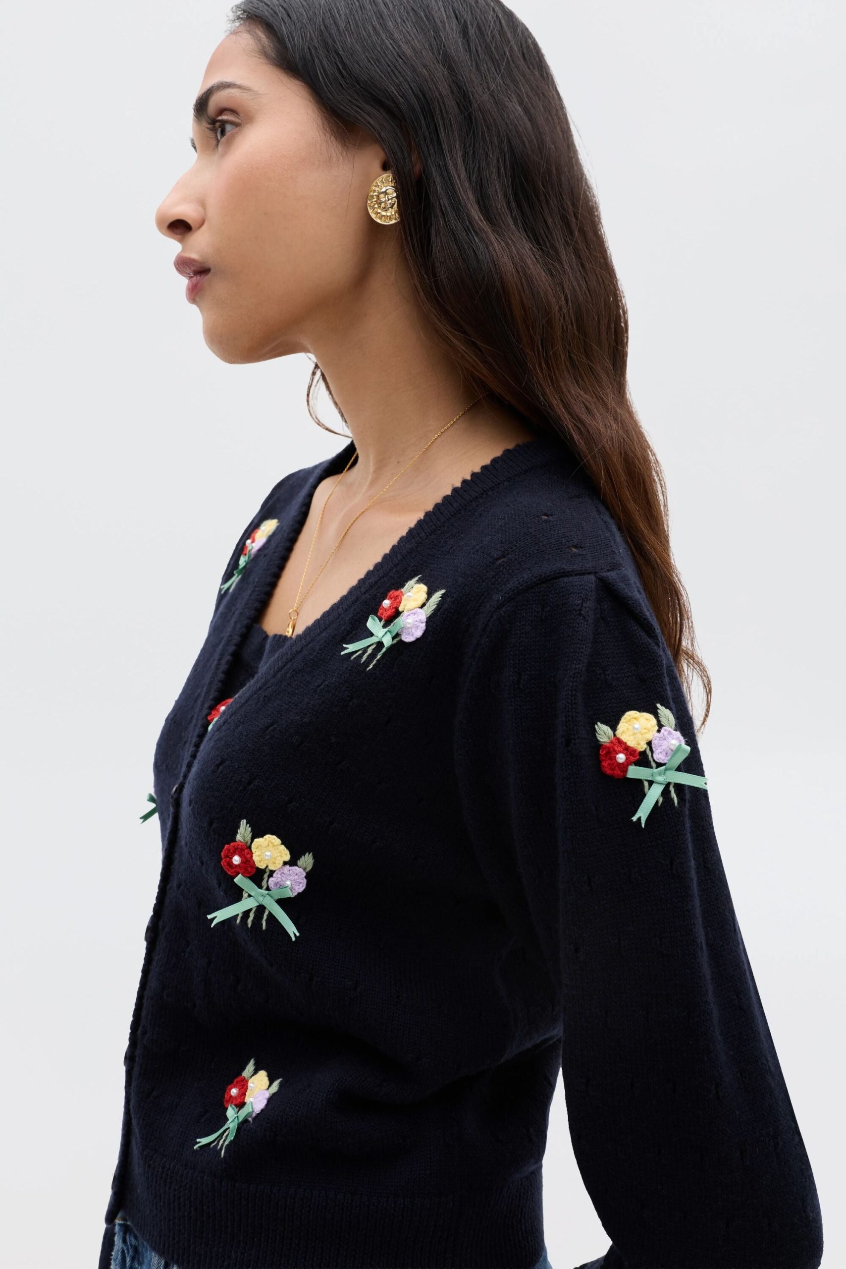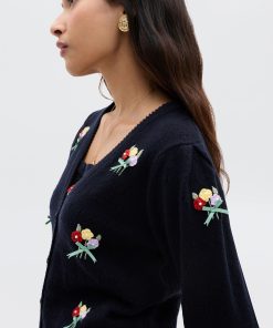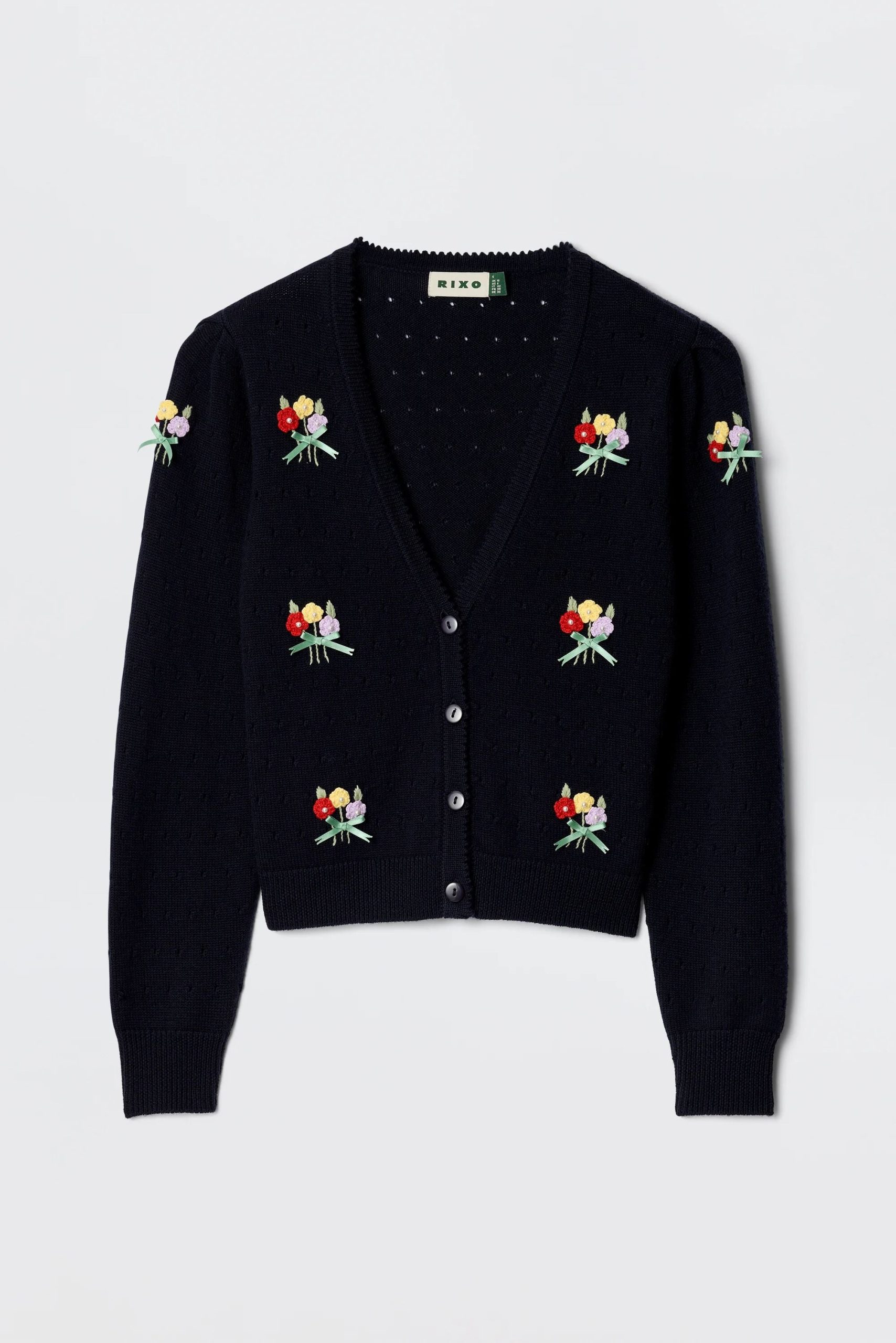 Product detailsDetailsMerinda is half of our new knitted twinset. Made from featherlight but cosy merino wool, it’s the perfect layer for transitional dressing. Patterned with a signature RIXO bouquet embroidery and delicate pearl beads it evokes a dreamy nineties nostalgia. Pair with the matching Perla Top or wear on its own.Fit