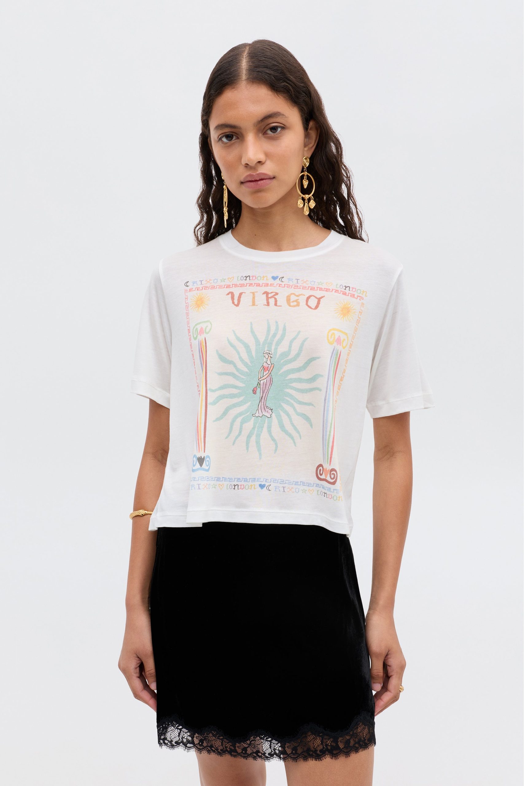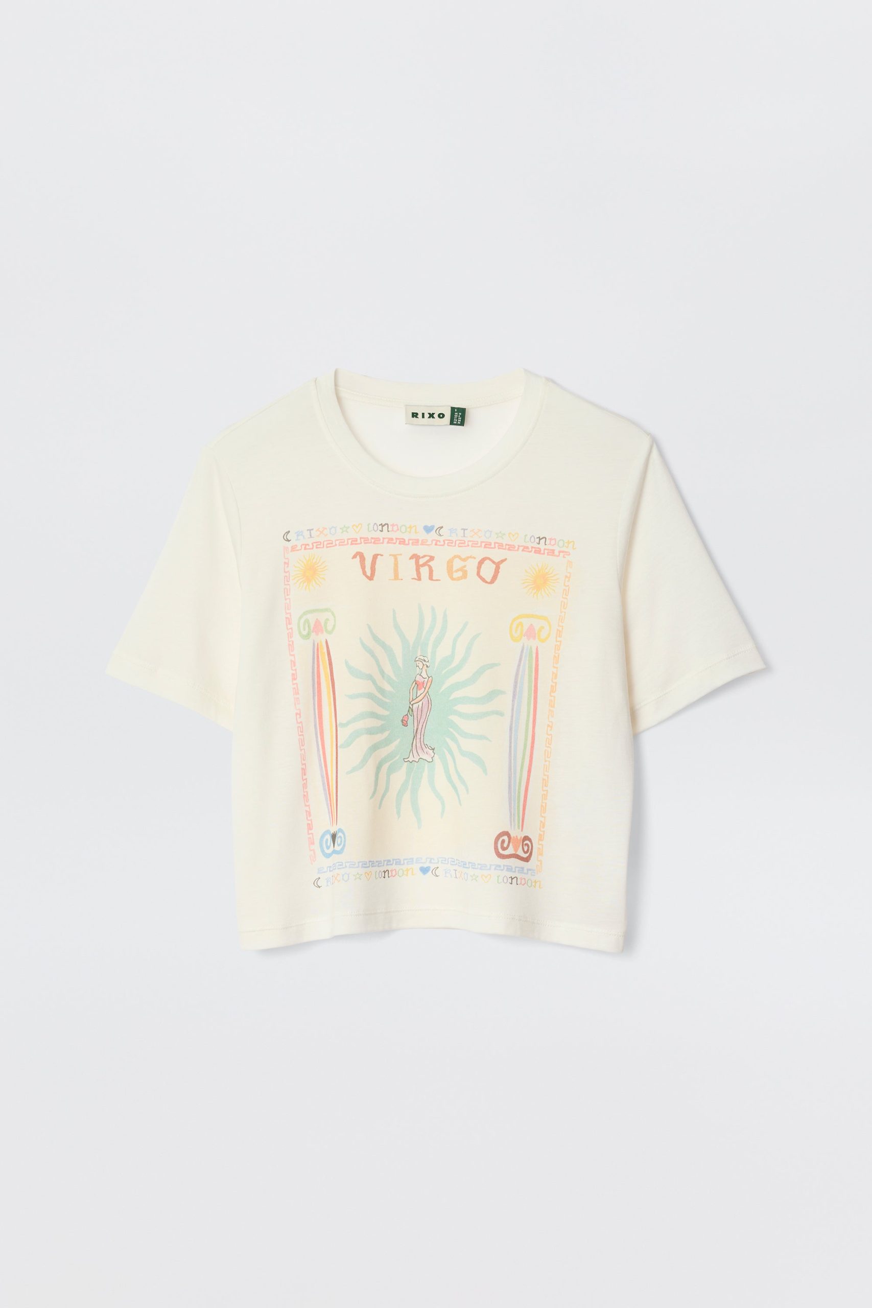 Product detailsDetailsOur Co-founder, Orlagh, sketched this Virgo illustration by hand so each Ria T-shirt is unique. It’s made from slightly sheer jersey with a cropped hem that’s easy to tuck into your favourite RIXO skirts.Fit