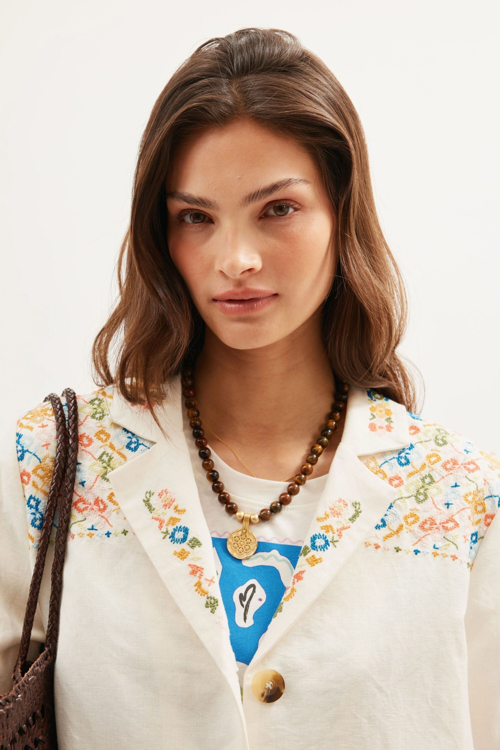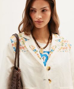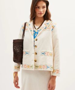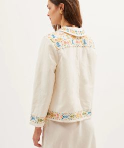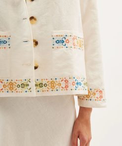 Product detailsDetailsThis Taya jacket is made from a new linen cotton-canvas fabric – it’s perfect for the warmer months and has a natural texture to it. It’s detailed with intricate cross-stitch embroidery and neat blanket-stitched edges.Fit