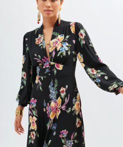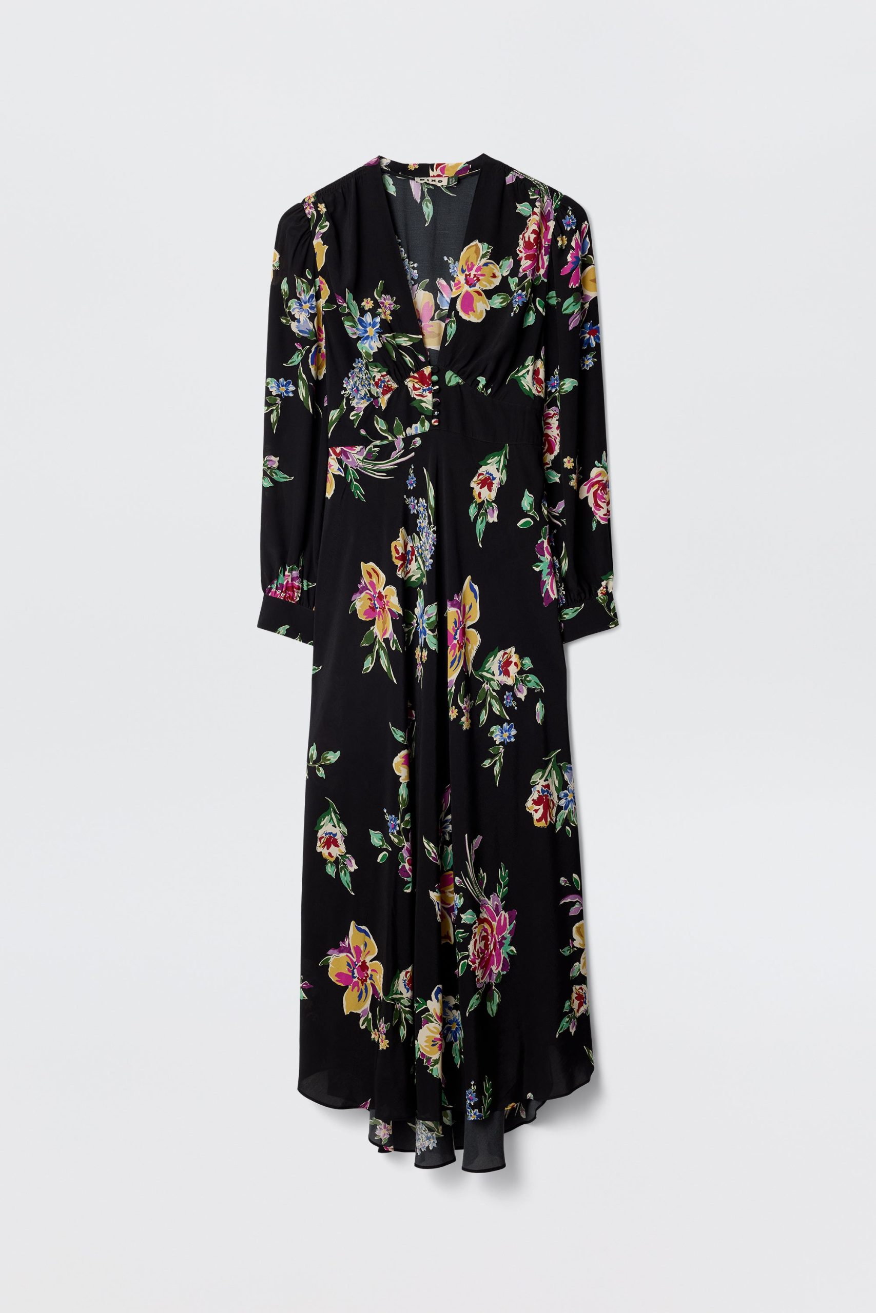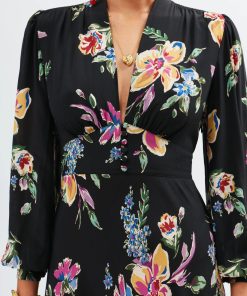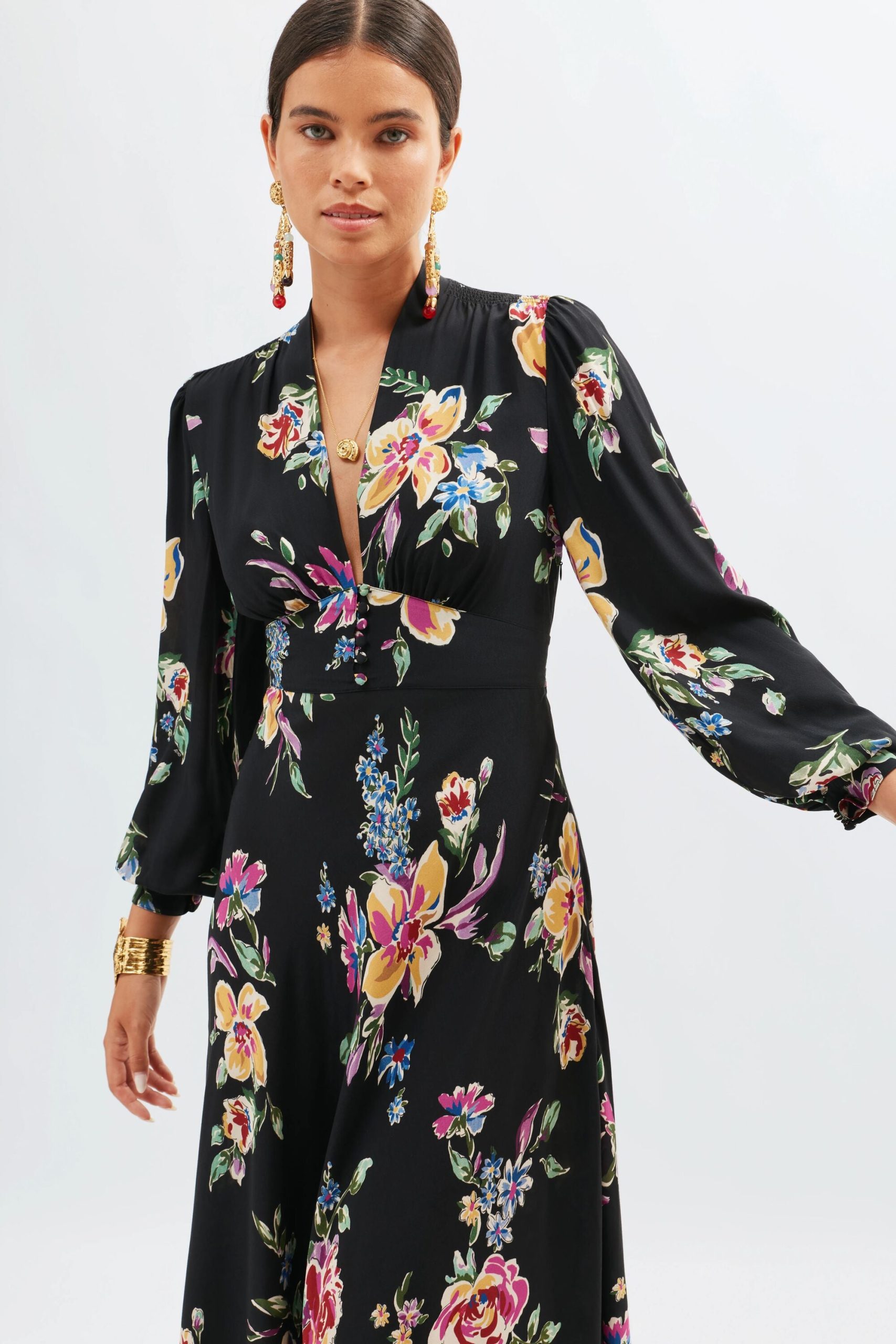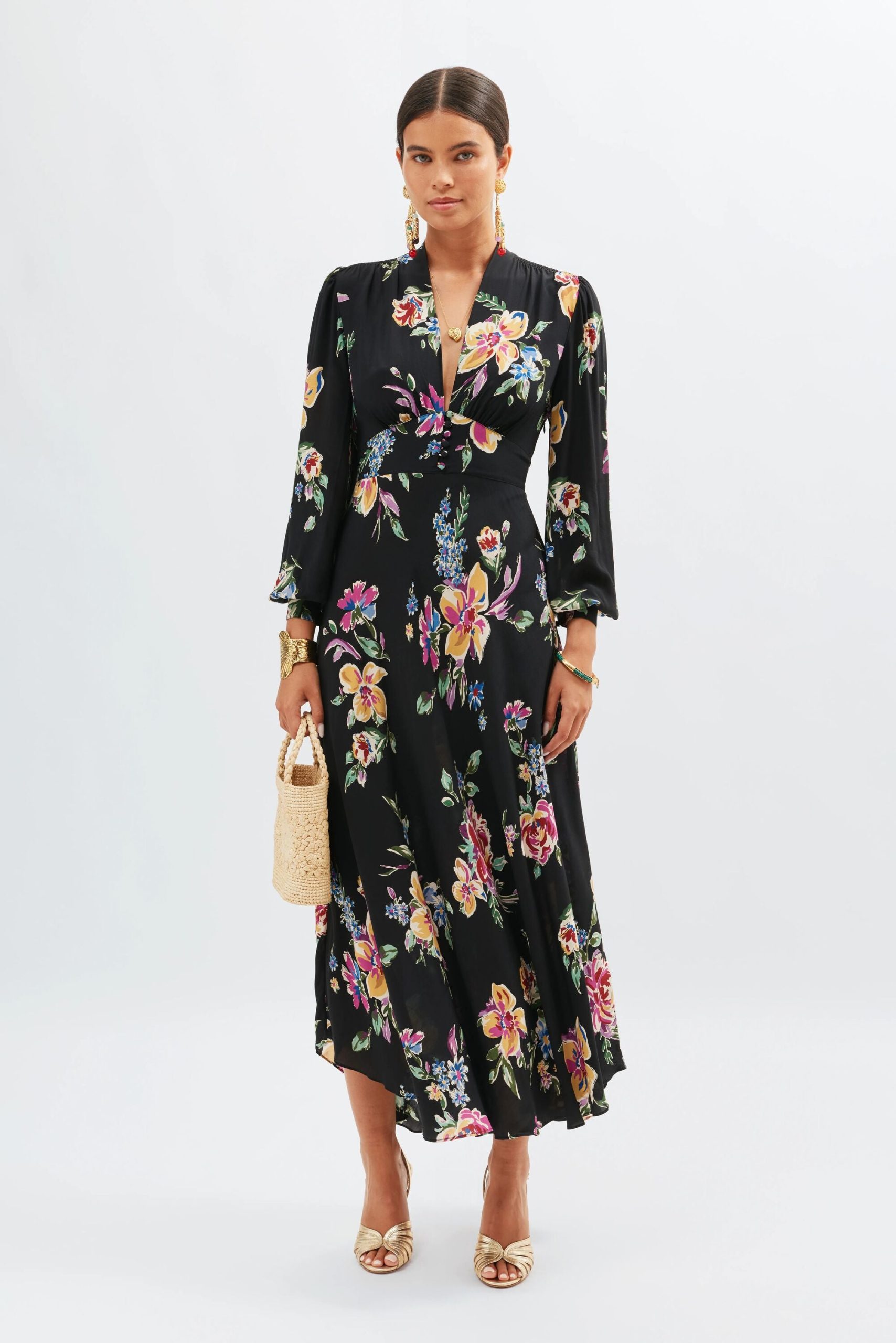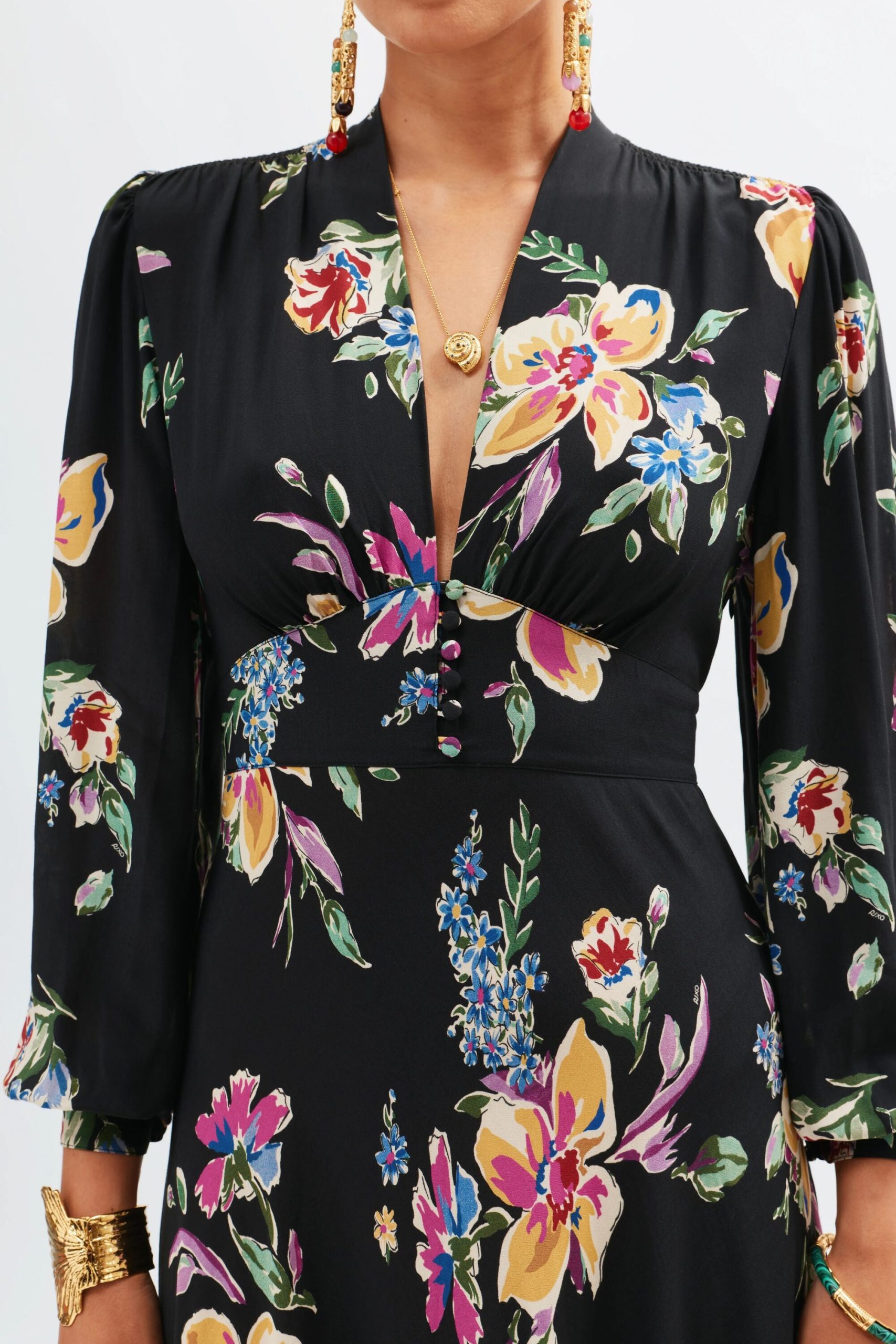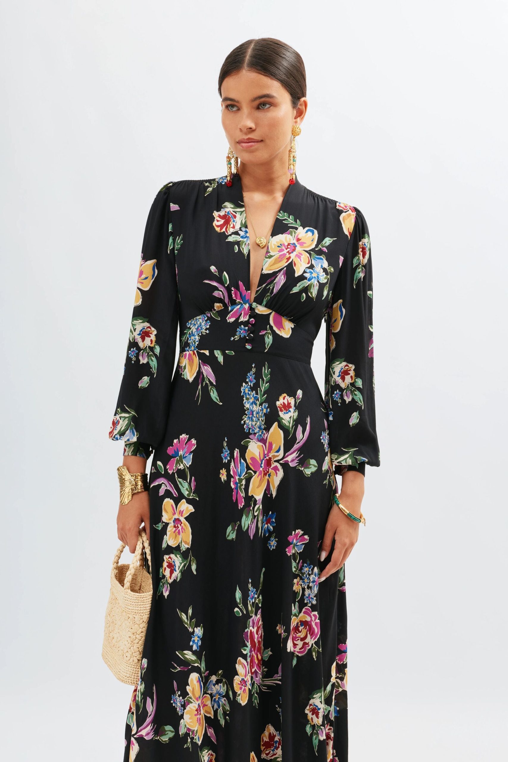 Product detailsDetailsTrula is a maxi dress designed to elevate every special moment. A RIXO exclusive, featuring a V-neck, hand-painted floral motifs. A beautifully flattering silhouette fitted at the waist. Wear with your favourite suede sandals for an effortless look.Fit