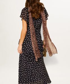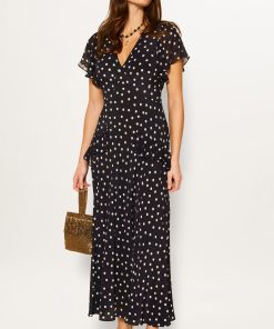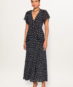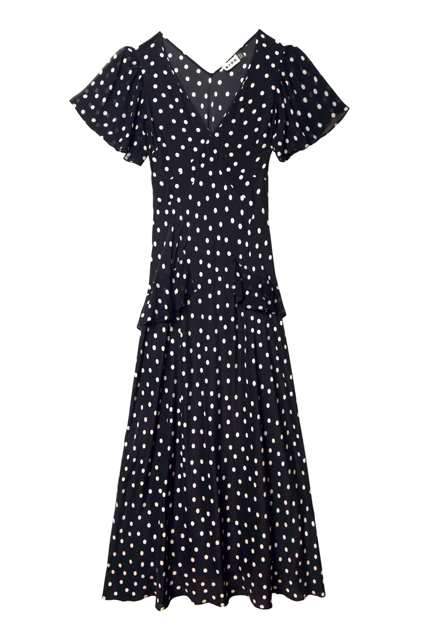 Product detailsDetailsAvailable in regular and petite. Our silk crepe de chine Evie dress is such a popular style thanks to the fluttery georgette ruffles, bra-friendly neckline and waist-cinching ties. We know this polka-dot version will be a favourite – the dark navy is easy to wear night or day.Fit