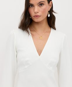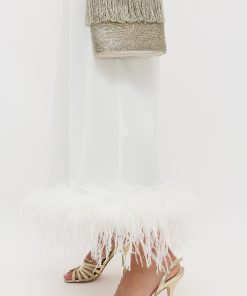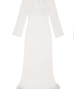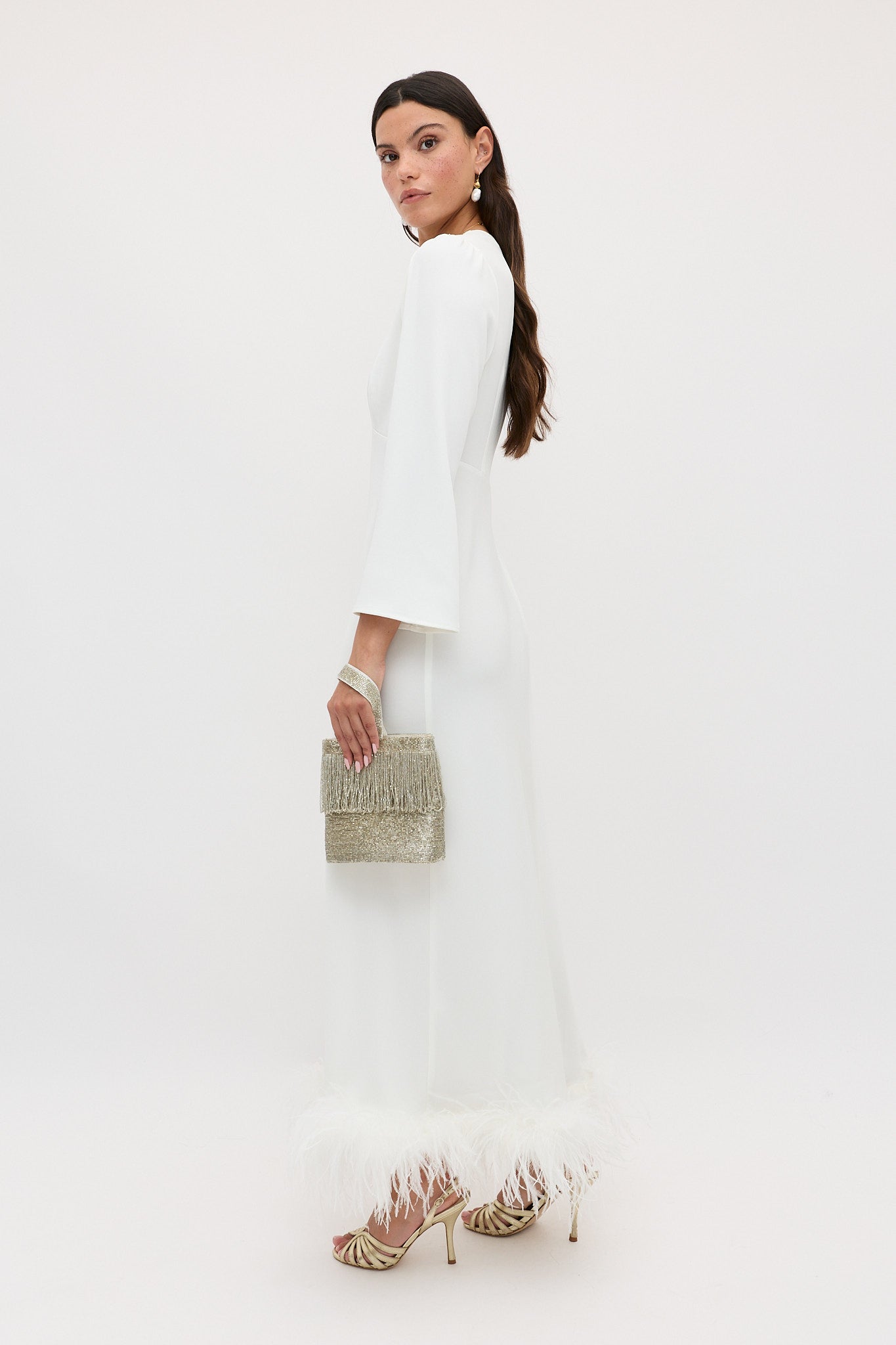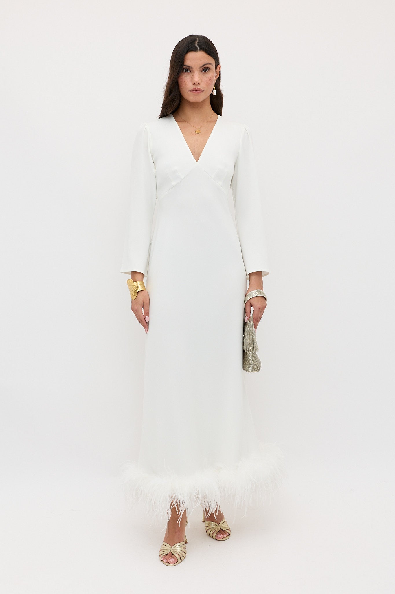 Product detailsDetailsOur Mya gown is simple but beautifully striking thanks to the dramatic feather-trimmed hem. It’s tailored in our signature bias-cut shape, with flared sleeves and underbust seams that nip in at the waist. Prefer a mini? You’ll love Toni.Fit
